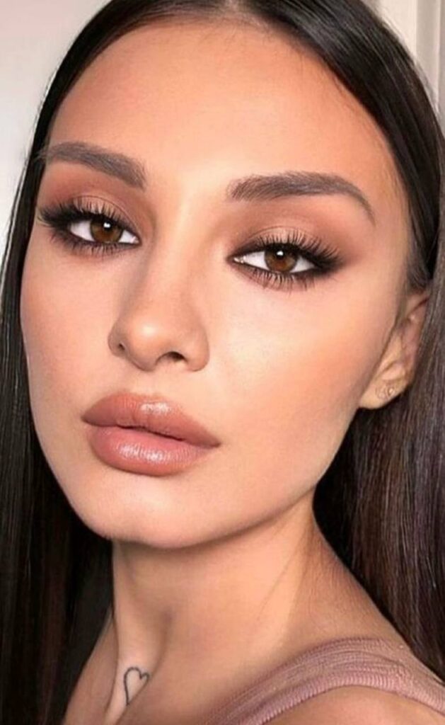 A soft neutral glam look enhances your features without competing with your outfit. It adapts effortlessly whether you’re wearing black, white, red, green, or even multicolored prints.